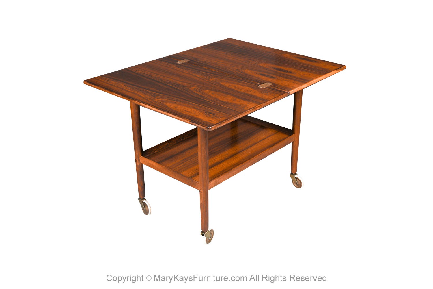 An exceptional Mid-Century Modern serving expandable bar cart by Grete Jalk for Paul Jeppesen Denmark, circa 1960s. Beautifully crafted from rosewood, this cleverly designed piece features a sliding upper top that slides and turns 90 degrees and expands to a 35.5″ wide serving surface. The beautiful rosewood top and brass hardware creates a stunning contrast. Elegant, yet functional, the rosewood bar top slides and flips open for an extended surface on both sides when entertaining, doubling the serving space. This stunning cart rolls over both hard and carpeted floors with four hooded castors. An exemplary mid century bar cart with its simple form is enhanced by a rich warm rosewood patina that only develops with age. A wonderful example of mid century modern furniture, this drink trolley will add to your family’s entertainment experience with its function and design.