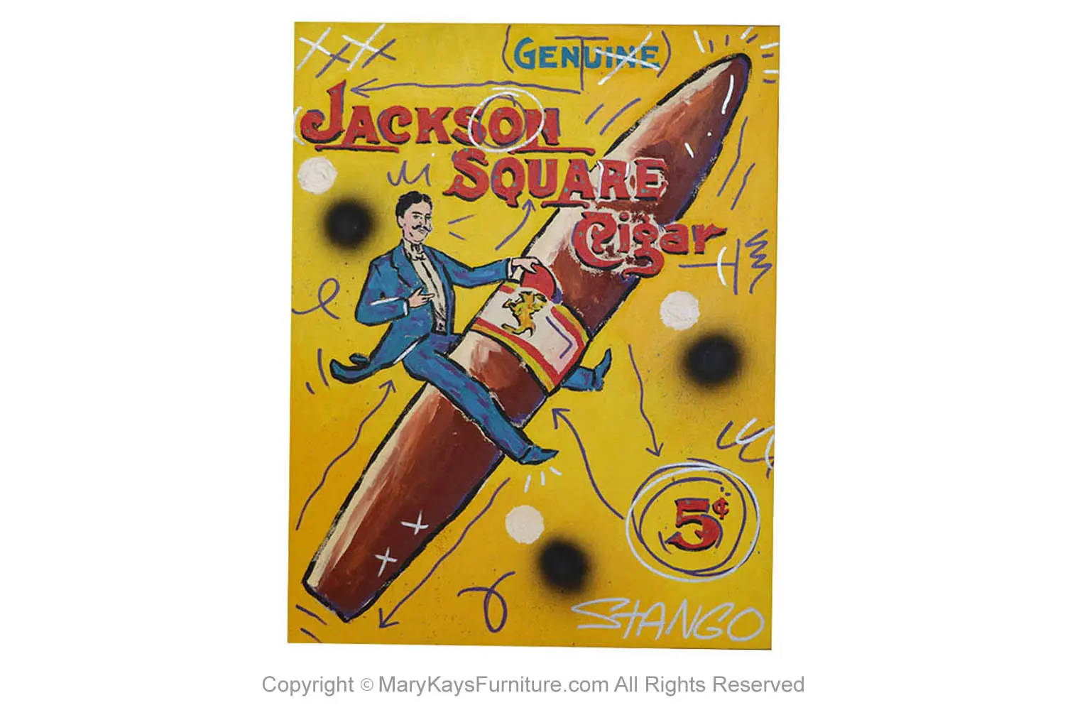 John Stango (born 1958) An original vintage work of art on canvas 31″ x 24″ unframed and signed “Stango” (lower right). This fine example of Modern American Pop Art from the 1950’s, is inspired by Jackson Square brand cigar advertising poster. The artwork comes from a private collection. “Genuine Jackson Square Cigar” is a painting in the style of vintage advertisements depicting a well-dressed man in a blue suit, playfully riding an enormous cigar, as if it were a rocket or mechanical bull with an impressive yellow background. Influenced from advertising imagery from the 50’s and 60’s, along with contemporary Pop artists. This is a nice example of John Stango’s work. The painting is executed in bold colors and will add style to any mid-century design house or art collection. n n nArtist: John Stango (b. 1958) American nCreation year: 20th century nMedium: Canvas nMovement & Style: Pop Art nCondition: Good nCondition Details: this painting is in good original condition nMeasurements: H 31″ x W 24″ n n nAs an Emerging American Pop Artist, Stango’s work is represented in galleries from New York to California, Sweden to Japan, attracting patrons from a widely diverse demographic, his art appears in public and private collections throughout the country. John Stango (b. 1958) was raised and educated in Philadelphia. Hired by Macy’s and Bloomingdales for his artistic eye and expertise after graduating from Temple University, Stango quickly earned himself a place amongst the mid century modernist movement within the art community. A true mid century pop artist, working in the styles of Andy Warhol and Peter Max, Stango seeks and finds inspiration in the colors and subjects of the urban and glamorous 1950’s and 60’s he remembers from his childhood reality and dreams. He is internationally known for his bold colors, masculine and aggressive textures, and advertisement-esque depictions of mid century themes and celebrities. Currently he works out of a historic warehouse outside of Philadelphia painting full – time. n n