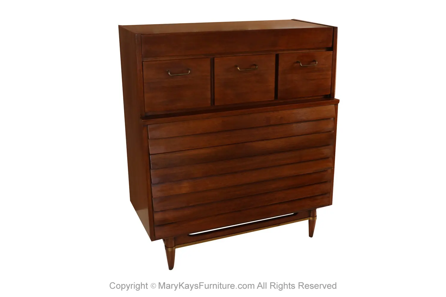 This exceedingly well-crafted American of Martinsville louvered slat front drawer highboy dresser was designed by Merton Gershun for his Dania collection, features the mid-century style and construction quality that keep these pieces in such high demand today. Beautiful all original walnut figuring and color, accented by satin brass hardware. Unique design with wonderful clean lines, three lower sculpted design slat front drawers without hardware, and classic brass pulls on three individual deep box top drawers, with a hidden flush, compartmentalized, felt lined drawer above, authentication stamp (American of Martinsville) on the interior drawer, brass trimmed on stretcher, adds to its unique style. Please see other listings, for the accompanying, matching low dresser available. nCondition Report: Original finish, with minor wear and light use indicators, small loss of veneer to each side, on bottom back edge, with repair patches, overall nice surface condition. Drawers slide open smoothly; solid, strong and sturdy, the base is tight level and supportive, interior is clean. Scuffs to the brass, construction is strong and sturdy. n nCreator: American of Martinsville (Manufacturer) Merton L. Gershun (Designer) nPlace of Origin: United States nPeriod: 1970-1979 nMaterials and Techniques: Walnut, Brass nCondition: Excellent original, some light scratches, oxidation on brass nWear: Wear consistent with age and use, Minor wear nMeasurements: 44.25″tall x 38.25″ wide x 18.75″ deep n n n