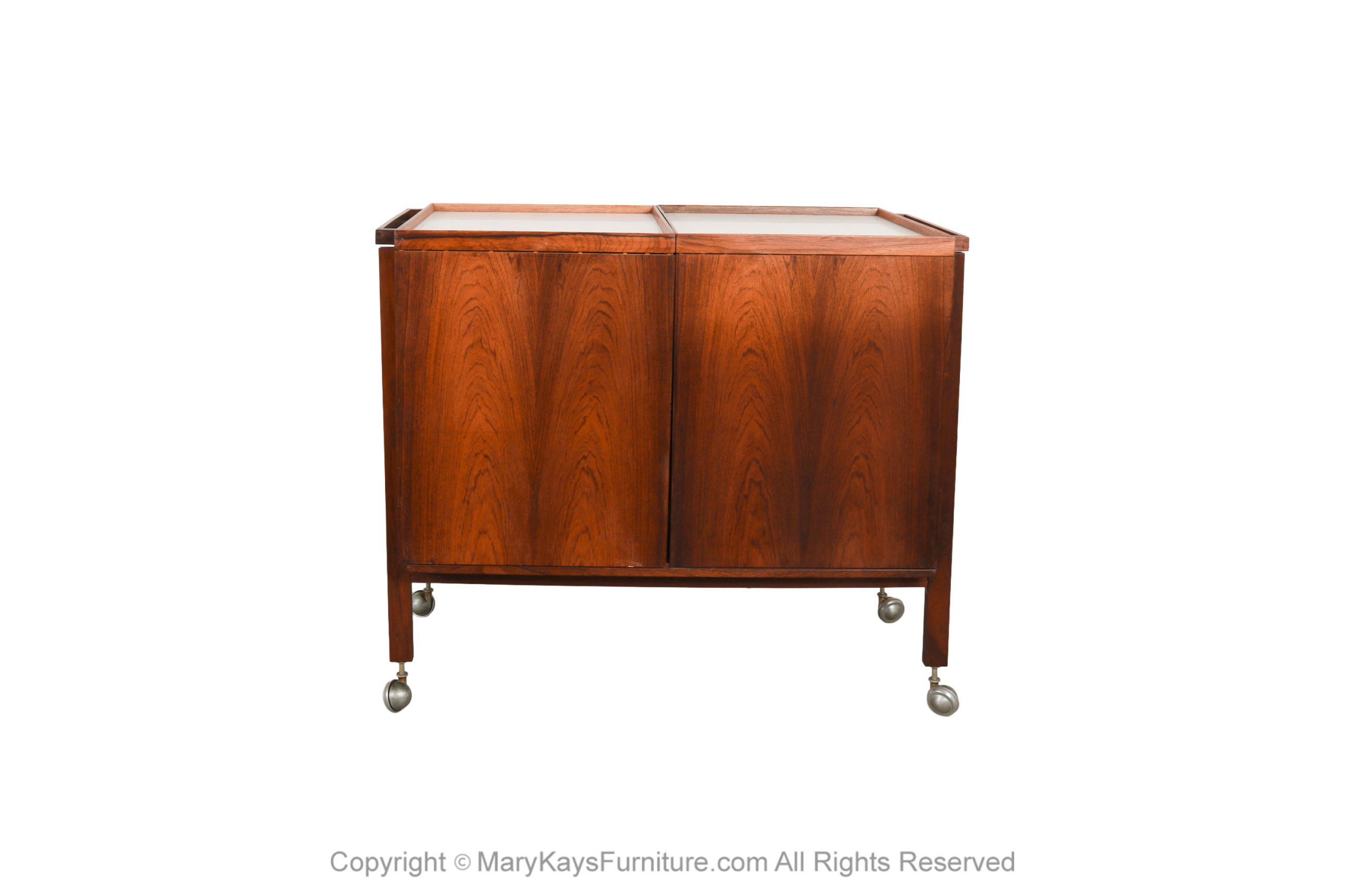Absolutely Gorgeous expandable, Scandinavian, Mid-Century Modern dry bar cart by famous designer Niels Erik Glasdam Jensen for Vantinge Mobelindustri, made in Denmark circa 1960’s. Featuring richly grained rosewood, with a fully finished back. The finished back side makes this cart ideal for placement in an open floor plan, making it a great focal point. The beautiful white, water resistant, laminate top and beautiful wood grain creates a stunning contrast. Elegant, yet functional, the white laminate bar top slides open extending up to 54.25″ to reveal an elegant glass shelf along the top center, below a pair of white wood sliding partitions for storing glasses, bottles, etc. This beautiful cart is mounted on castor wheels for easy maneuverability when entertaining and accommodating guests. When not in use, this unique cart closes to function as an attractive side piece. A perfect addition to any style of interior…truly a showstopper!