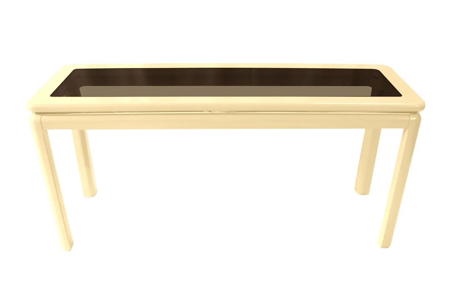 A lovely mid-century lacquer finished console table with smoke glass insert by Lane Furniture. The n ntable displays a high gloss ivory/cream finish with smooth, rounded edges on the entire piece. The top n nhas an inlay of smoked glass and flows down to an inset of brass banding, giving a ‘belted’ look to the n ntop and a sort raised platform appearance. The legs are fitted at each corner and are rounded on the n noutside and inside with flat bevels on each that create clever shadowing and invite the eye, (and hand!) n nto appreciate the design. This is a modern classic that can fit with any décor. n n n nManufacturer: Lane Furniture n nOf the period: Mid Century Modern n nPlace of Origin: United States n nMaterial: Wood, Glass, Brass n nDate of Manufacture: circa 1960s n nCondition: Excellent n nWear: wear consistent with age and use n nMeasurements: 26.5in tall x 56in wide x 18in deep