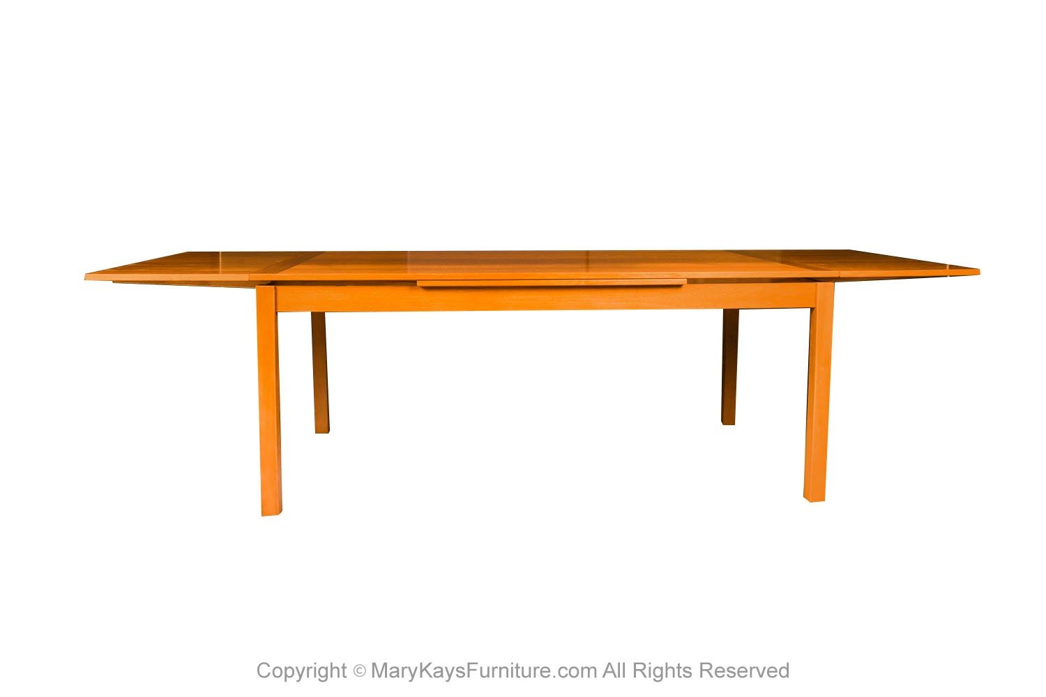 An exceptional Danish Modern teak extension dining table by Ansager Mobler made in Denmark. With an initial large footprint, this table can also offer a generous space and double in size once its hidden draw leaves are extended. Amazing design and construction detail, with two built-in self-storing leaves. Simply pull out a leaf on one or both ends to extend the table and create a table that will easily seat 10! This table expands to 111 1/2_ (9.29 feet) long! Wonderfully rich Teak color and grain texture throughout. The rectangular table teak surface with stylish teak grain on the top surface, raised on strong sturdy legs, extends to a large size with two built in leaves. Fully extended it becomes a large conference table, exquisitely constructed, characteristically sleek and functional and exudes an aesthetic beauty as well making it perfect for the modern interior. This is a wonderful table that offers two large leaves, changing it from a medium size table to a large table. Each of the leaves is 19 1/2” across, making this a versatile piece indeed, built to last the test of time. Very good original condition firm and solid build. Sleek two-tone design and sturdy construction add to the attractiveness’ beautifully aged teak with rich patina, quality craftsmanship and exquisite design. Stamped on underside Ansager Mobler made in Denmark. nCondition Report: Good original condition, minor surface wear, very sturdy. n nManufacturer: Ansager Mobler nOf the Period: Mid-Century Modern nPlace of Origin: Denmark nDate of Manufacture: Ca. 1960’s nPeriod: 1960-1969 nMaterials and Techniques: Teak nCondition: good condition. nWear: Wear consistent with age and use nMeasurements: 30 1/4_ tall x 41 1/2_ deep x 72_ L (closed) 111 1/2_ (9.29 feet) fully extended each leaf is 19 1/2_ long n