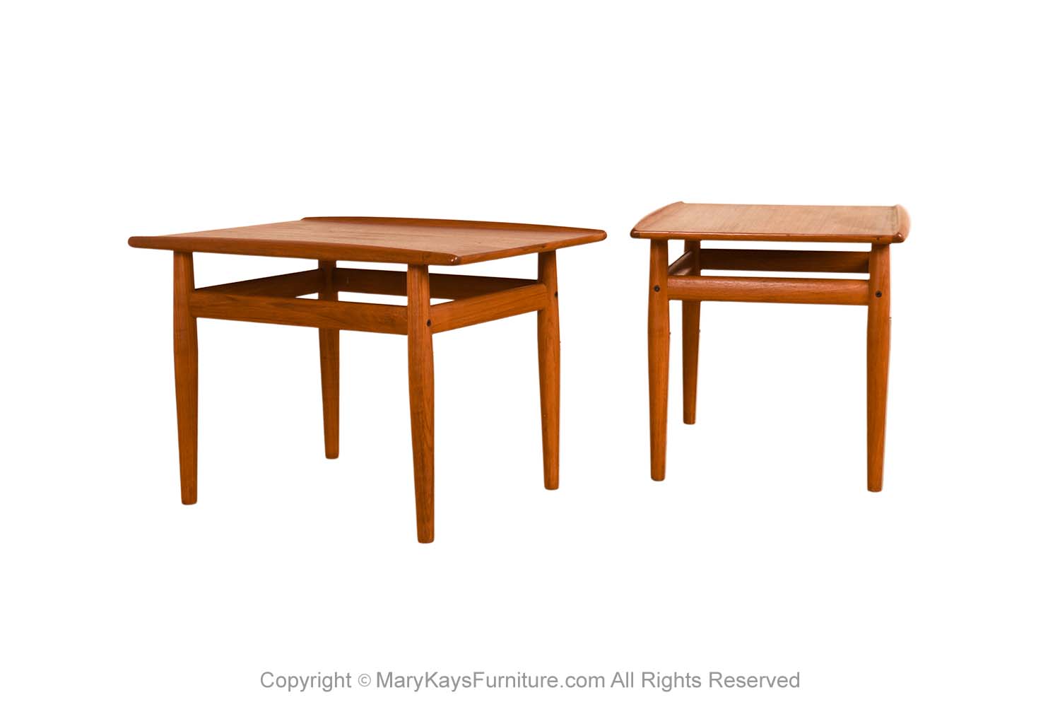 A beautiful pair of mid-century modern, teak Danish side tables by Grete Jalk for Glostrup Mobelfabrik, circa 1960’s. Constructed of solid teak. Each feature elevated sculpted curved edge trim that runs the length of the side edges with a diminishing slope leading the eye to a vanishing point, enhancing the sleek profile. Beneath stylish stretchers accented with Jalks signature brass fastener. Both rest on stylish round tapered legs. Manufactured logo beneath (Danish Control Made in Denmark by Glostrup Mabelfabrik Mobel Fakta). The pair maintains its original beautiful teak finish with a wonderful warm hue. This is an outstanding selection for serious collectors of mid century modern Danish. A gorgeous sight to behold in person! They can be used as an end table/side.