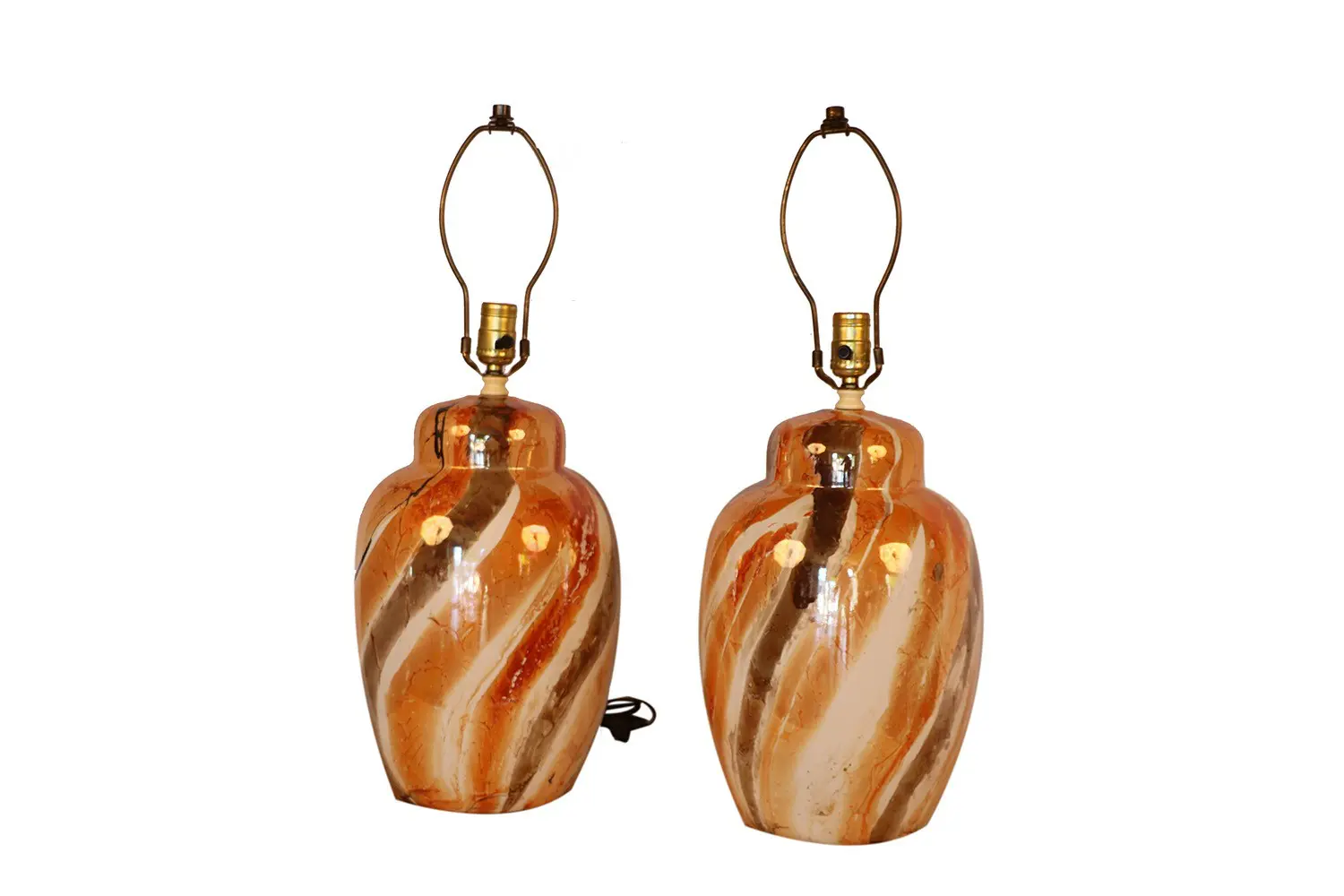 A beautiful classic pair of mid-century glazed ceramic ginger jar form table lamps. Stunning pair, circa 1960’s, features organic clean lines, made from a mix of natural and man-made materials, ginger jar form ceramic lamps, decorated with a rich swirling luster glazed ceramic with marble like design in muted earth tones of burnt sienna, brown and peach, on a cream ground. nCondition Report: Original finish and wiring, no finish problems. Remaining in fine quality and working condition throughout. n nMaker: Unknown nOf the Period: Mid Century Modern nPeriod: 1960-1969 nMaterials and Techniques: Ceramic nCondition: Good nWear: Wear consistent with age and use nMeasurements: 25.50″ tall x 6.5 Diameter n n n n n n n n