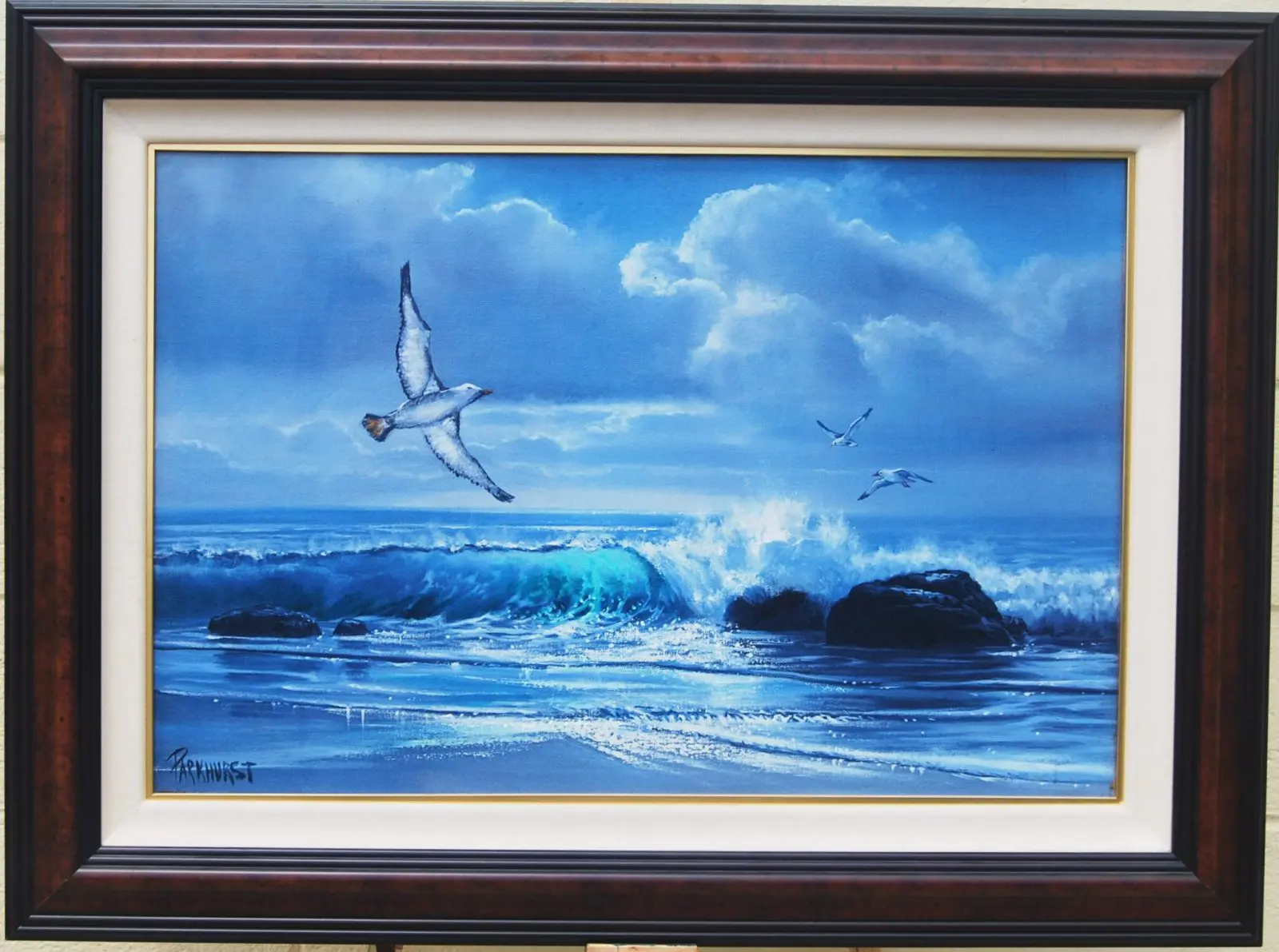 n“Violet Parkhurst paints seascapes -life-like studies of the bubbling foam- flinging seas of the world, which thunder off the shores in their wild rush for the beach. Her range of work, from the mysterious moonlit seas, to the shimmering summer surf, is inspired by her undying thirst for life and the beauty that surrounds us every day.”nnViolet Parkhurst’s legendary seascapes are exhibit in exclusive museums and private collections around the world. Her extensive list of five million collectors include four US Presidents, two Presidents of China, King of Saudi Arabia, and a host of celebrities including her very first admirer Clark Gable. Parkhurst paintings are currently exhibit on permanent collections in dozens of museums around the world including the Beijing National Museum (China), Stockholm museum (Sweden). She has also exhibited in the famous Louvre, Paris and Prado, Madrid museums. In 2004 Violet Parkhurst was honored for her contribution to the arts by the city of Los Angeles with granting of her own namesake day, Violet Parkhurst day, November 2nd.nViolet Parkhurst was born in Derby Line, Vermont. As a child, Violet showed in early Penchant for drawing. She later attended the school of practical Arts in Boston, where she won a scholarship to the Museum of fine arts in Rio de Janeiro. Her early career was followed by a year of study at Baylor College in Waco, Texas. Violet finished her formal training in the arts at Los Angeles State College.nTwo of her seascapes were chosen with 24 other artist’s paintings to tour Europe for the cultural exchange. The show was at all major museums including the Louvre and Prado. The two paintings are now in the permanent collection of the Stockholm Museum. In the spring of 2002 Violet Parkhurst was invited to China and the China national Museum of fine arts and was installed as Professor Emeritus at the Jilin Art College.nViolet has served on the board of directors for the Hollywood bowl Easter sunrise service and her artwork has been used on the cover of the program for the past 20 years. For her lifetime achievement Violet is listed in Who’s Who in the world, who’s who and international art, Community leaders, Noteworthy Americans and American artist of Renown.nnDescription: Moonlight (American, 20th century)nSigned, titled and numbered 230/500 on the reverse and on the stretcher